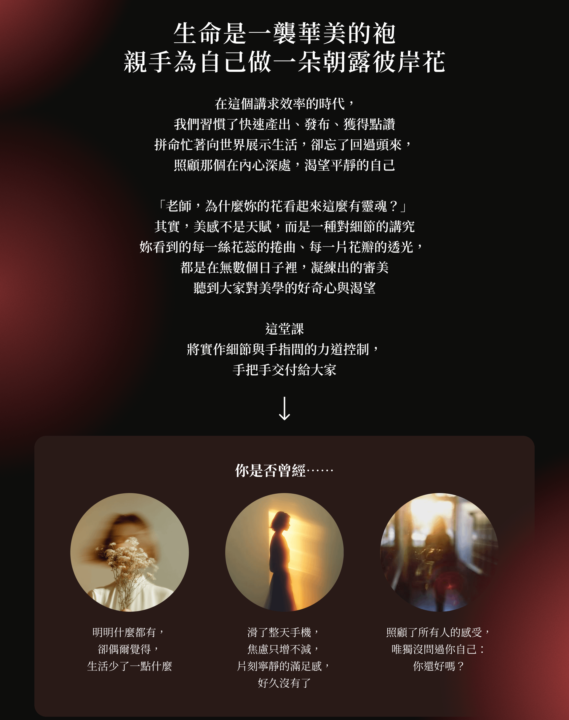 透過美學創作找回內心的平靜與力量,重新感受生活的價值。